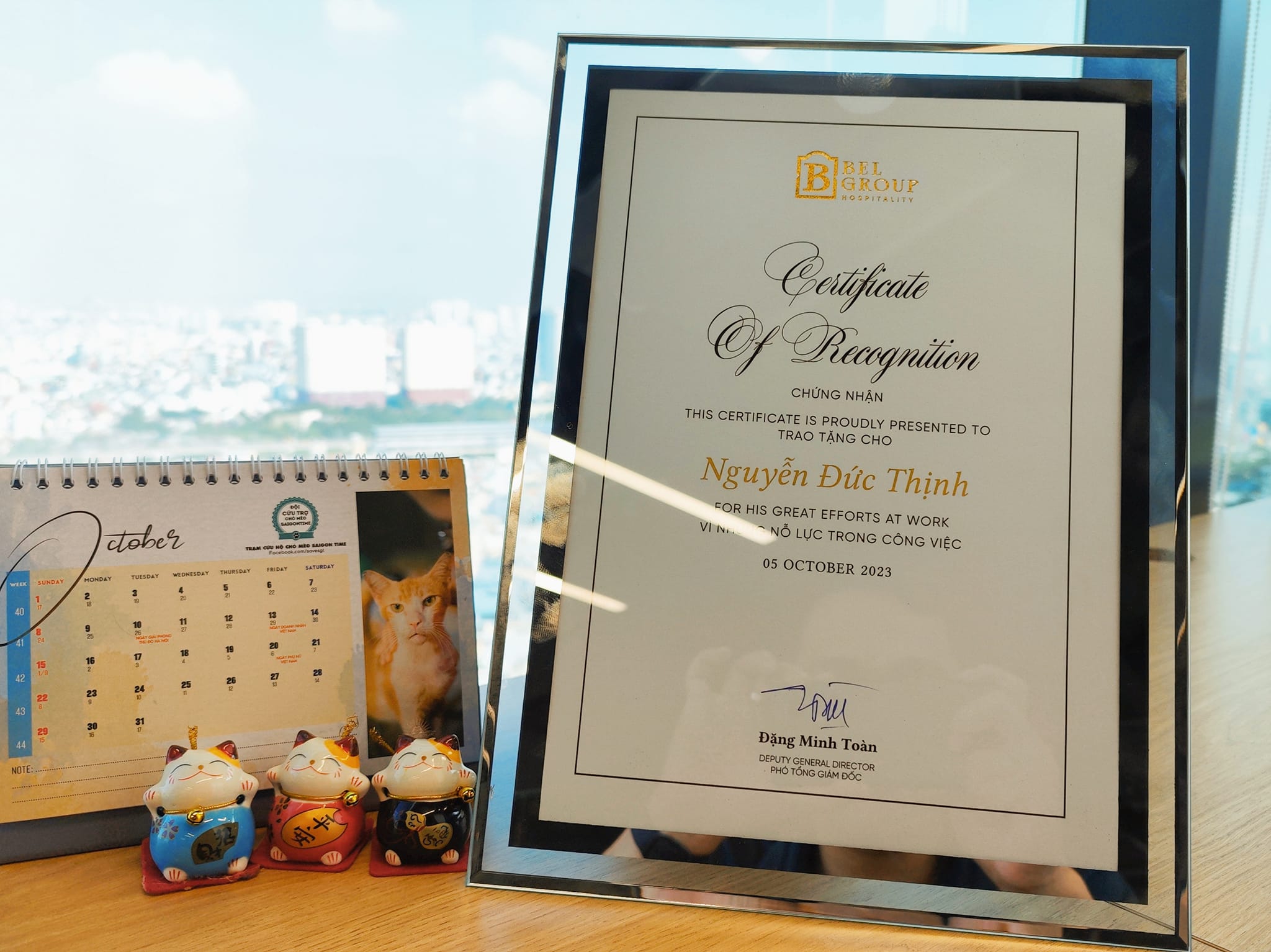 Certificate of recognition “For his great efforts at work” - BelGroup Hospitality 2023