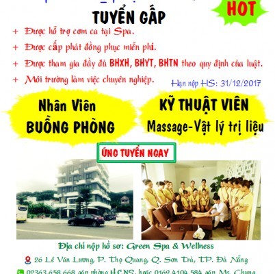 Giới thiệu về Green Spa & Wellness với quy mô 50 giường, tọa lạc ngay chân núi Sơn Trà (26 Lê Văn Lương, Q Sơn Trà, TP Đà Nẵng) không gian yên tĩnh, khí hậu trong lành. Chúng tôi mang tới dịch vụ chăm sóc sức khỏe chất lượng cho cộng đồng với bài thuốc tắm lá Dao đỏ kết hợp với bài xoa bóp bấm huyệt của người Việt. Vì vậy chúng tôi đang tìm những cộng sự để cùng chúng tôi thực hiện sứ mệnh này.