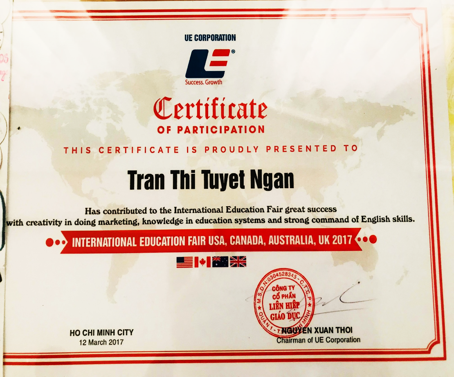 Interpreter for Study Abroad Seminars • Main Duty: Translating English into Vietnamese and vice versa between representatives of foreign colleges/ universities and Vietnamese visitors, in order to help them more convenient in consulting about problems related to study abroad. • Certificate of Participation: Contributing to great success of the international Education Fair with creativity in doing marketing, educational systems knowledge and strong command of English skills.