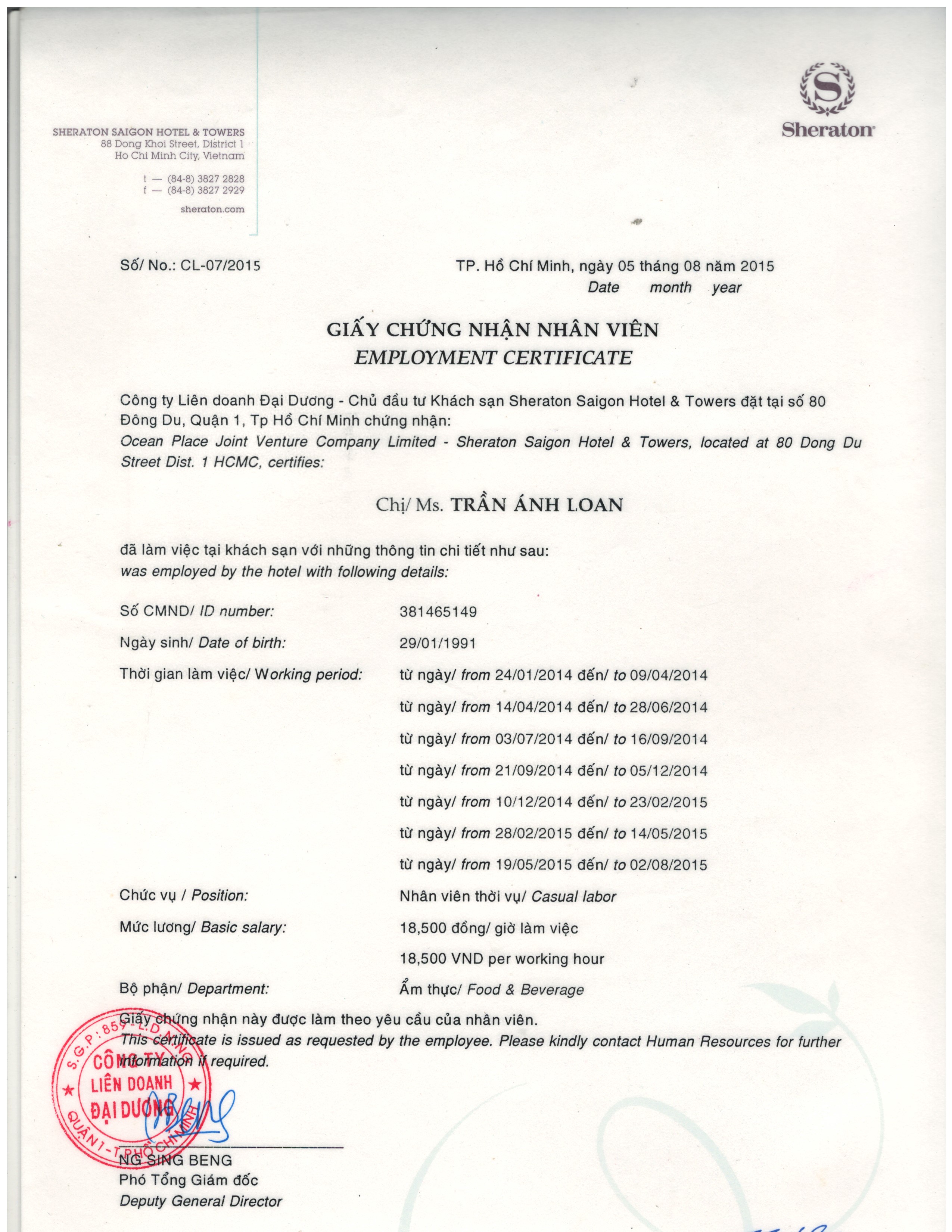 Banquet Casual Labor tại Sheraton Saigon Hotel & Towers