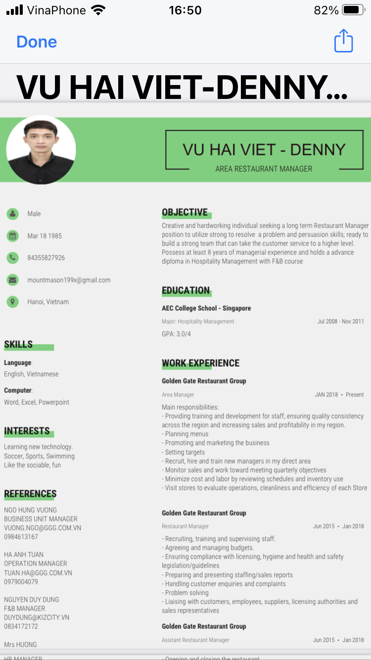 Hồ sơ ứng viên có số điện thoại, email và bao gồm 1 cv đính kèm.