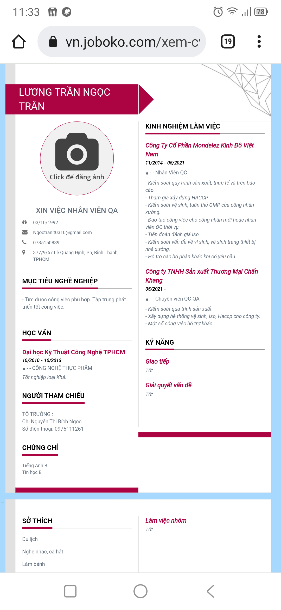 Hồ sơ ứng viên có số điện thoại, email và bao gồm 0 cv đính kèm.