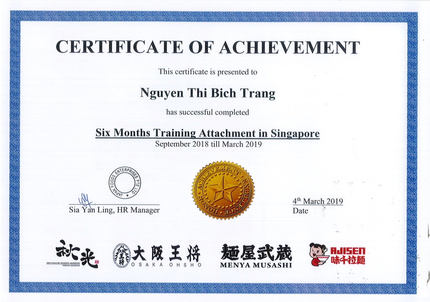 Trong thời gian đi học có thực tập 6 tháng tại chuỗi nhà hàng của Bachman Japanese Restaurant Singapore.