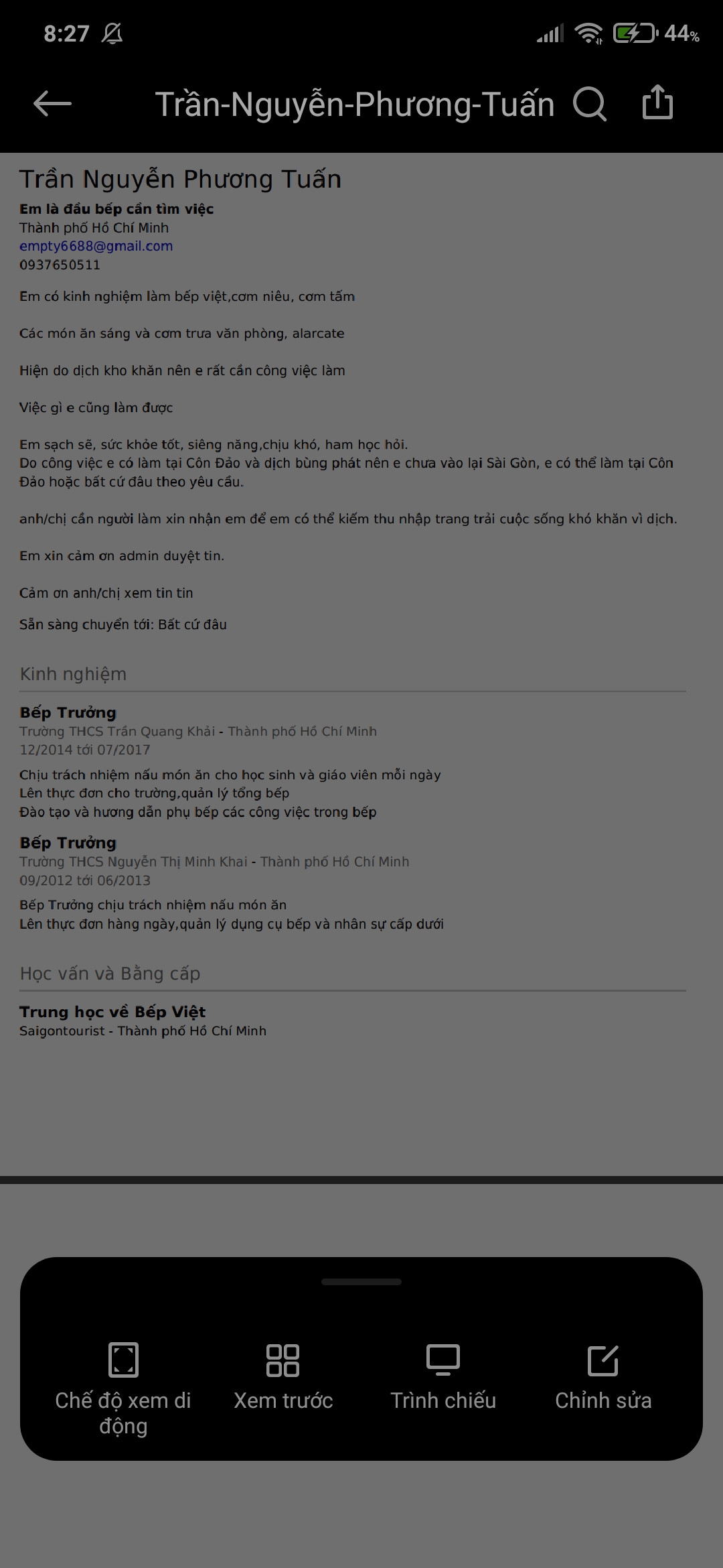 Hồ sơ ứng viên có số điện thoại, email và bao gồm 1 cv đính kèm.
