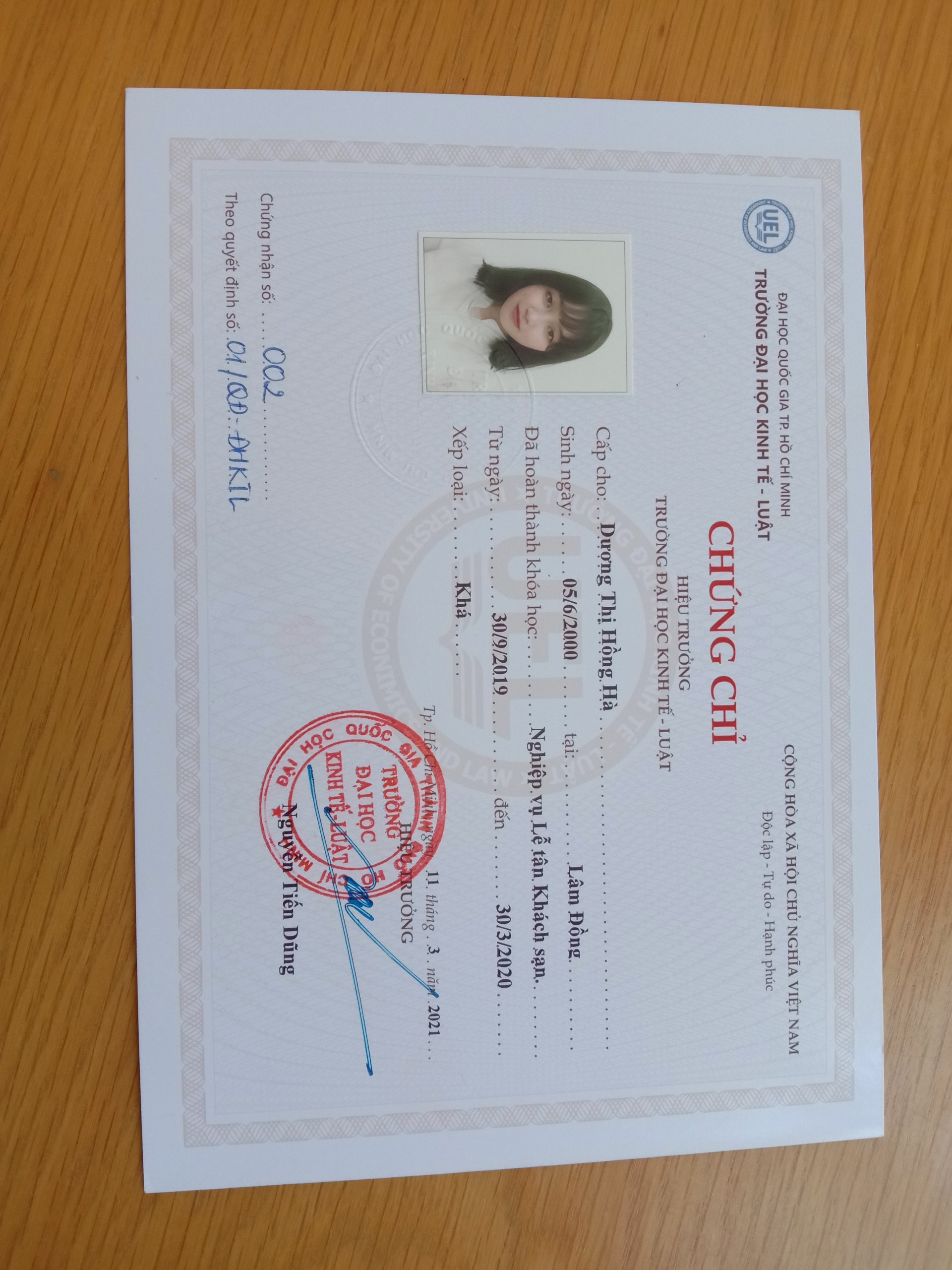 Trong khoảng một năm này, em đã vừa học và tim kiếm cơ hội việc làm lễ tân bằng cách xin đi làm phục vụ tại khách sạn. Sau đó thì đi thực tập tại Movenpick Hotel and Resort và tham gia các hoạt động chung của trường tổ chức.