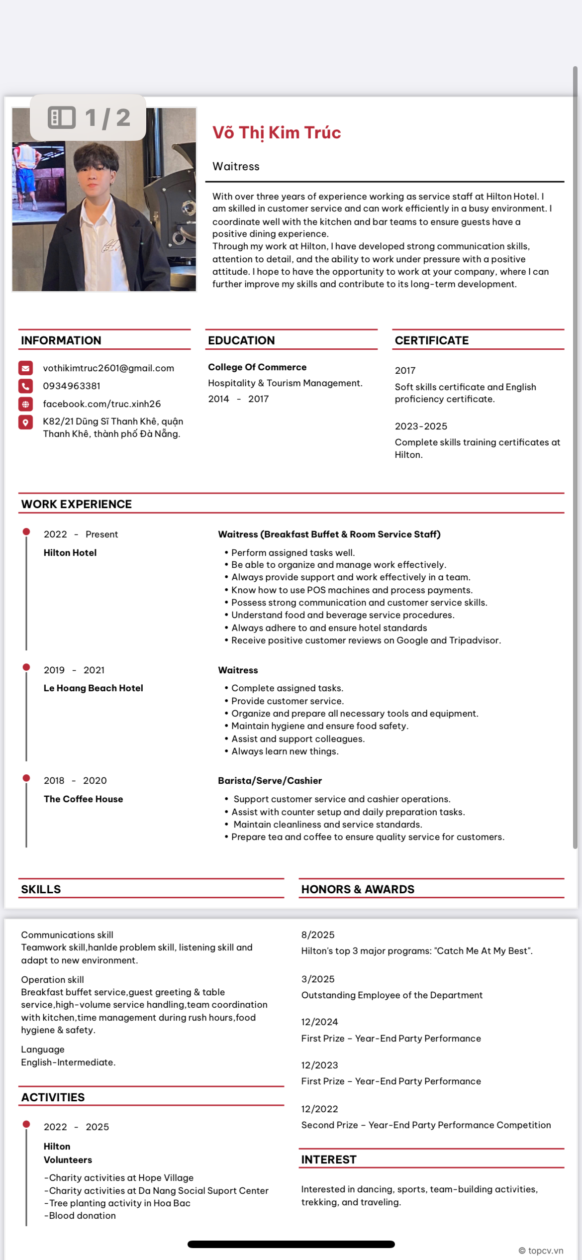 Trung thực, năng động và nhiệt huyết trong công việc, luôn cố gắng để phát triển bản thân