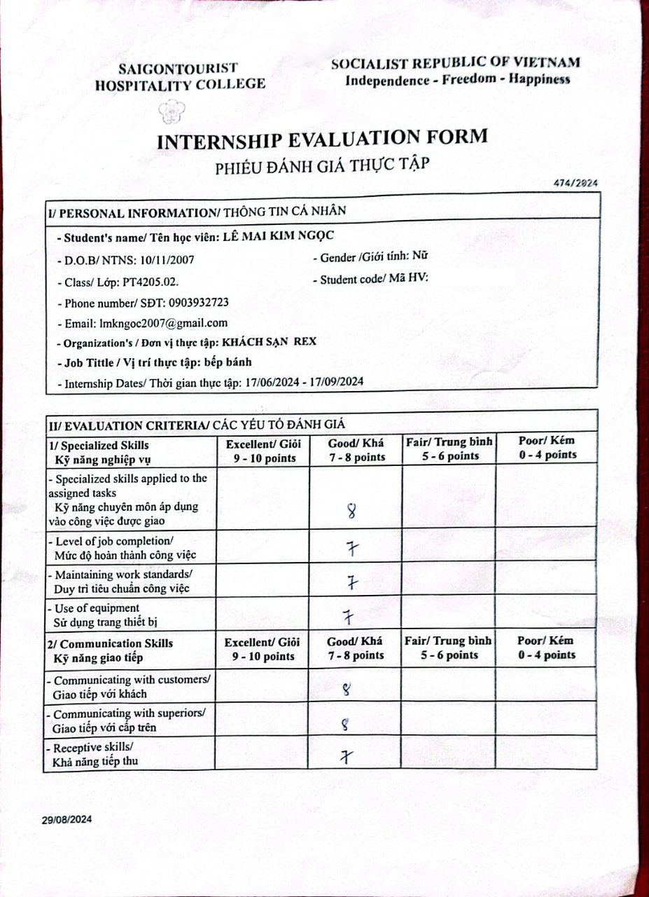 Em tên là Lê Mai Kim Ngọc, sinh năm 2007. Em vừa tốt nghiệp Trung cấp ngành Kỹ thuật làm bánh tại Saigontourist Hospitality College (STHC), khóa 2022–2024, đồng thời hoàn thành chương trình THPT năm 2025. Em rất thích với nghề làm bánh và mong muốn được làm việc trong môi trường chuyên nghiệp để học hỏi, phát triển tay nghề.