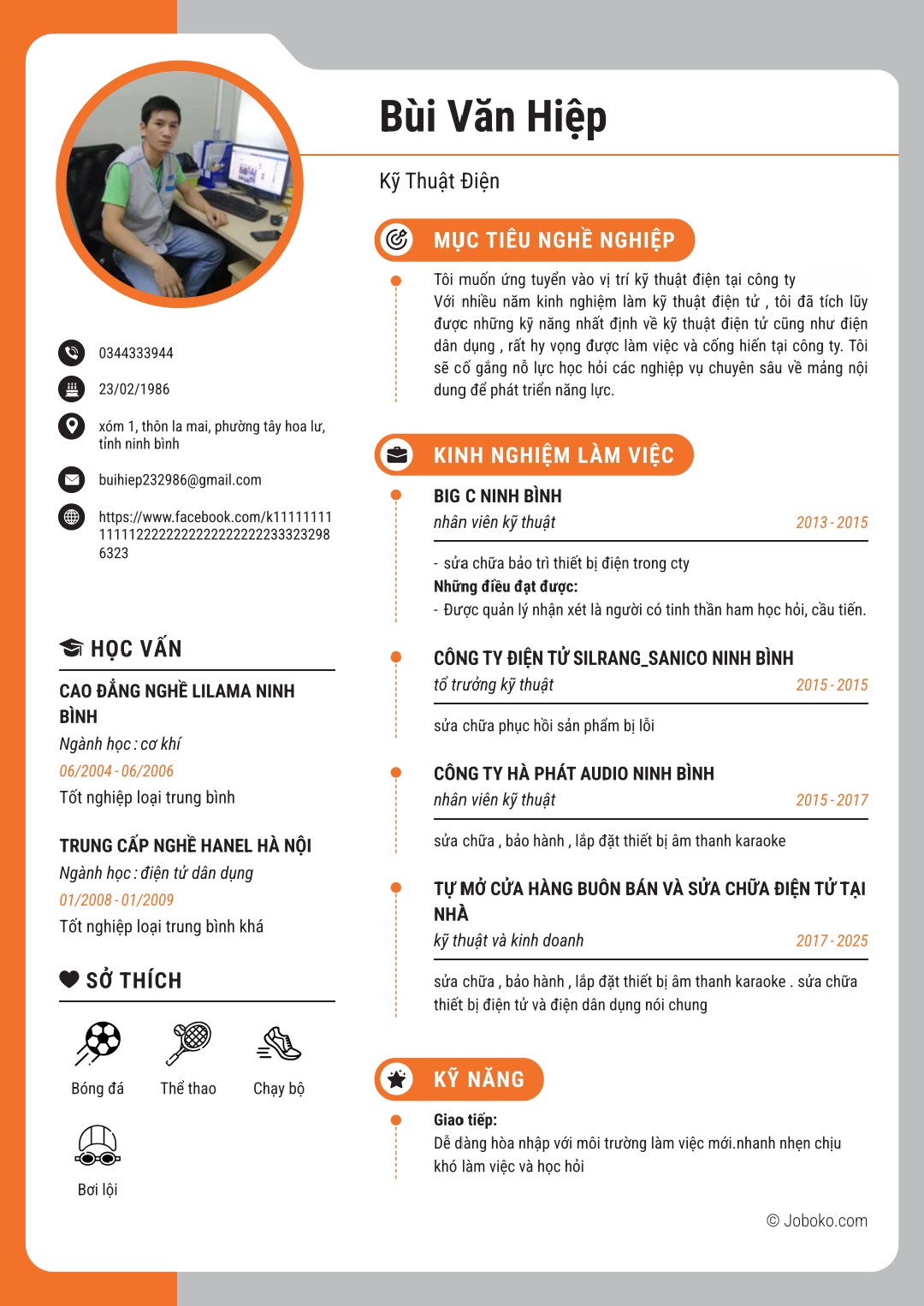 Mình cao 1m7 nặng 61kg . Là người chịu khó nhiệt tình ham học hỏi , hòa nhập tốt với môi trường làm việc mới . Từng học và làm cơ khí sau đó chuyển sang học điện tử và làm sửa chữa điện tử kết hợp cho thuê âm thanh ánh sáng sự kiện..buôn bán lắp đặt chỉnh sửa thiết bị âm thanh ánh sáng cho đến thời điểm hiện tại mình vẫn đang làm điện tử âm thanh ánh sáng...mình mở cửa hàng riêng
