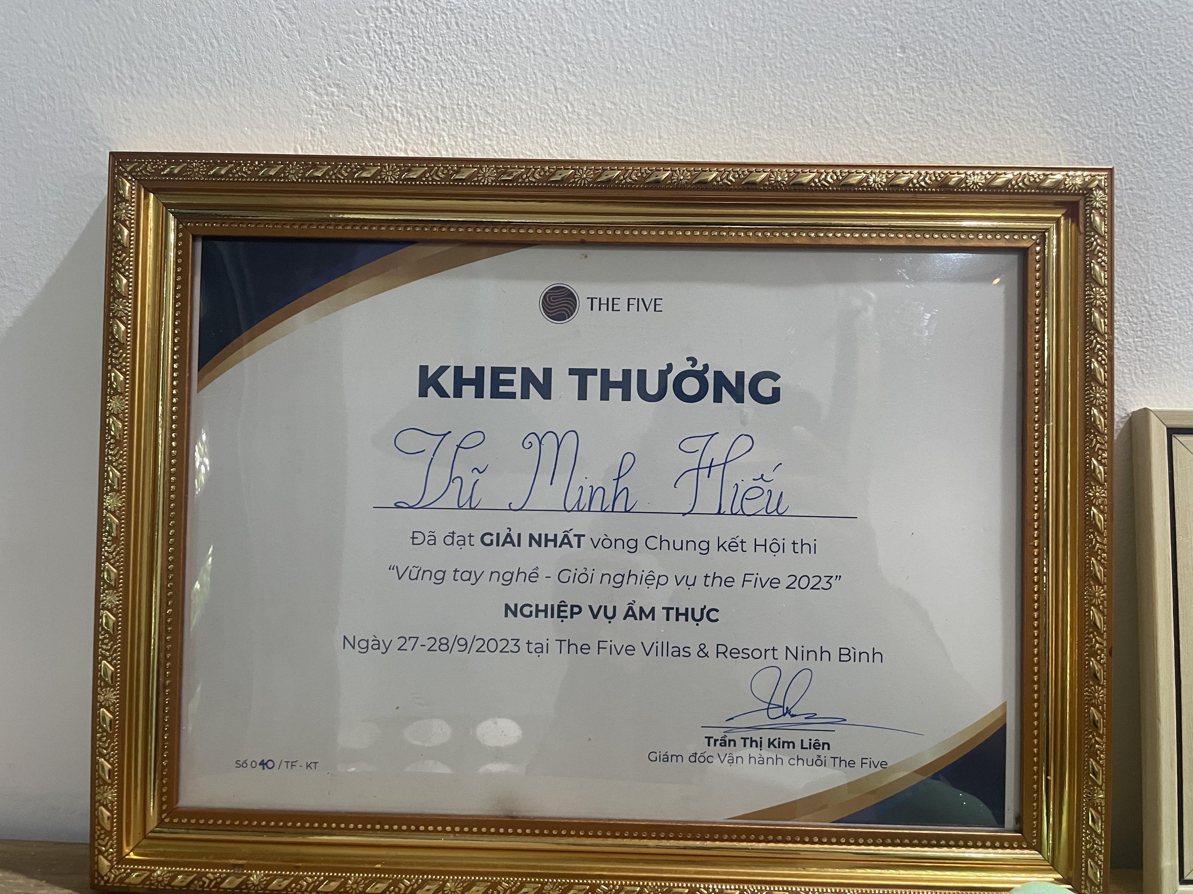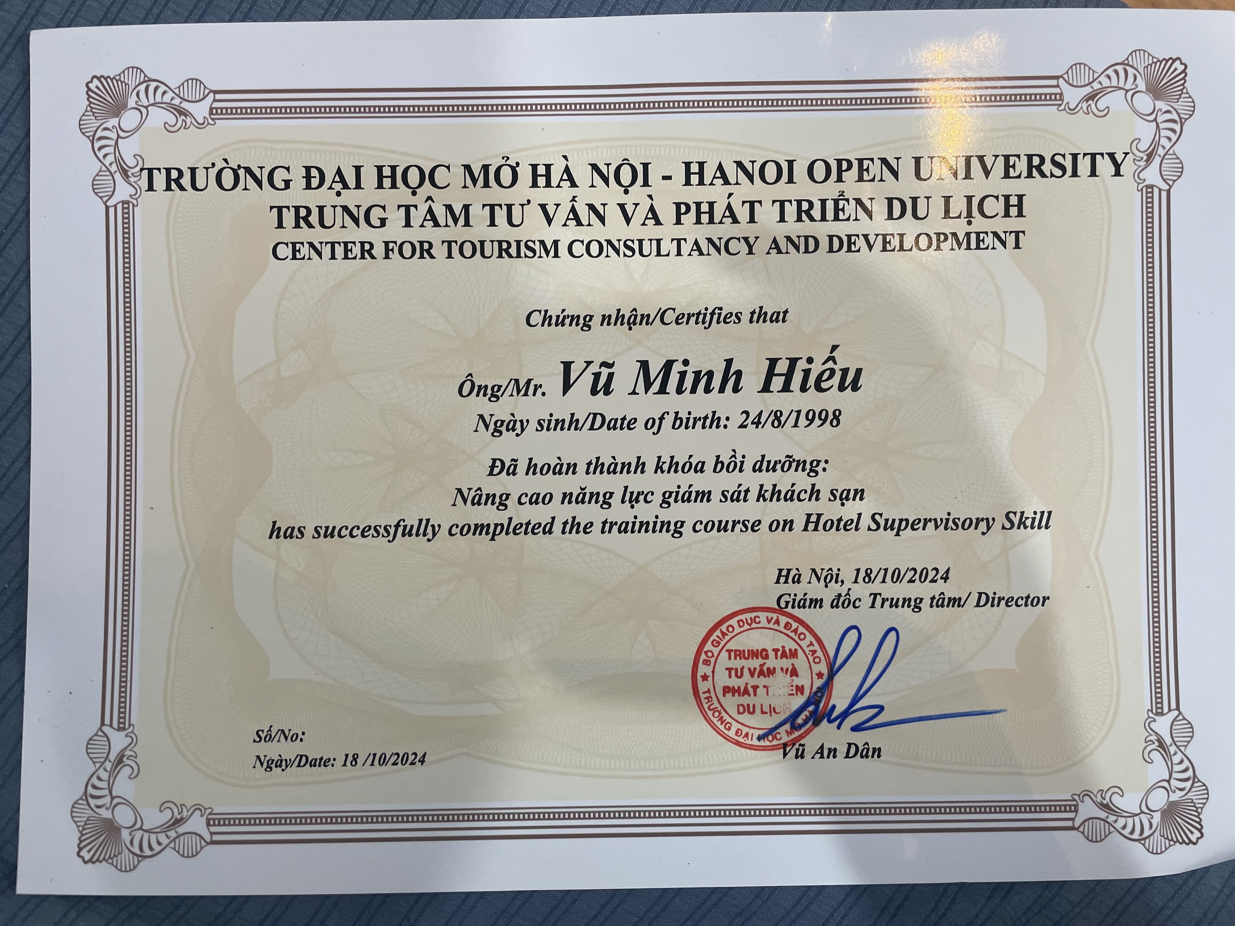Chưa hoàn thành, nhưng đã học thêm khoá chứng chỉ Bồi dưỡng quản lý cơ sở lưu trú du lịch tại trường