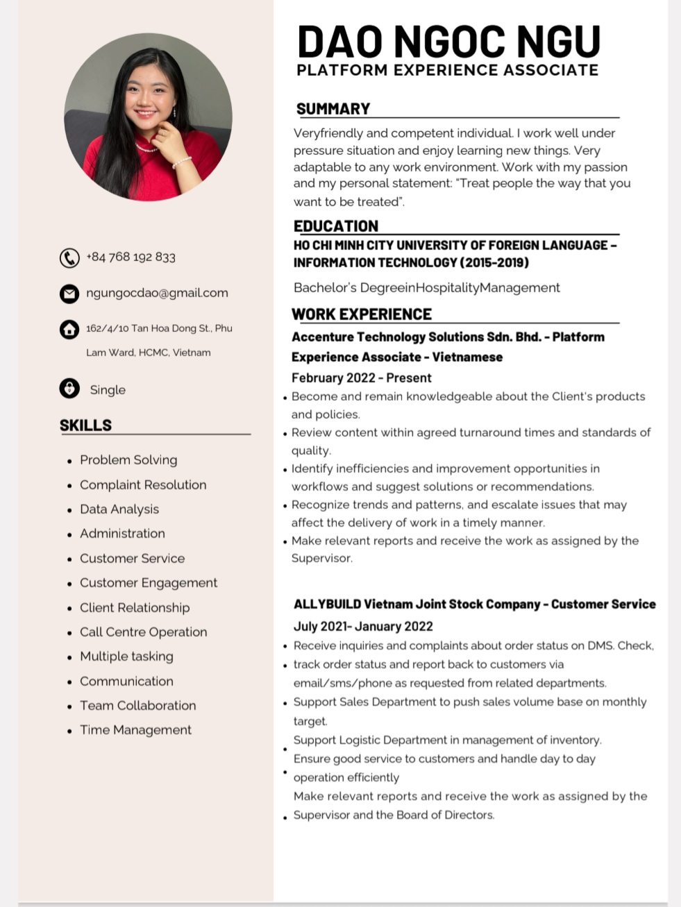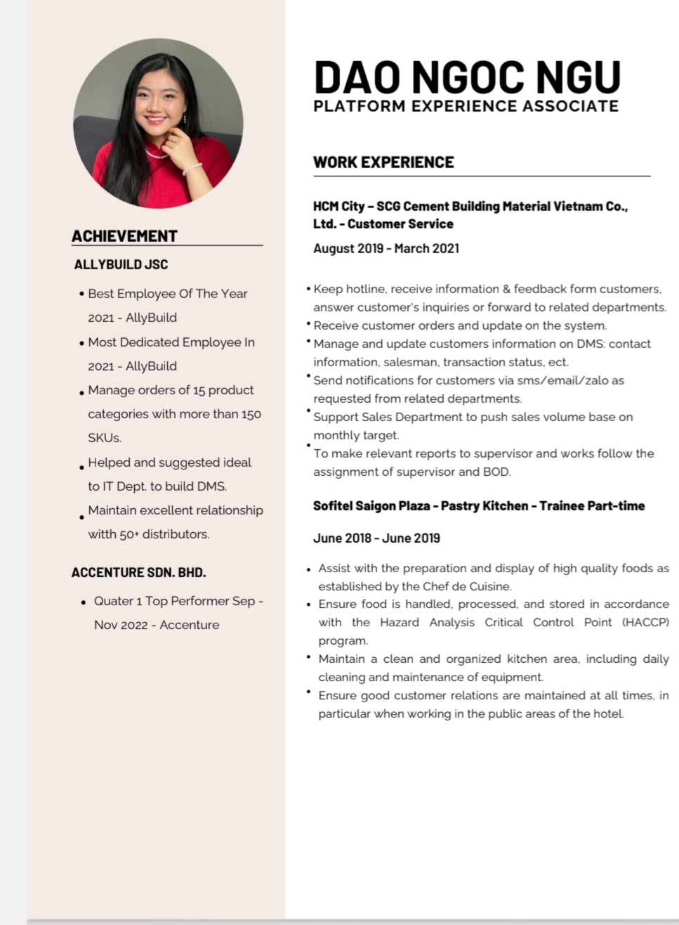 Đạt danh hiệu nhân viên xuất sắc của quý tại công ty Accenture.