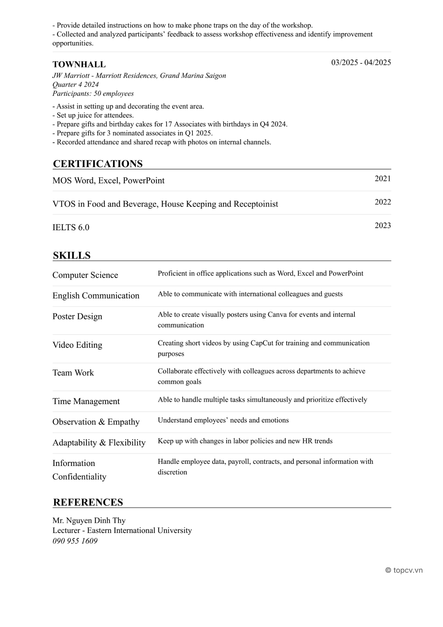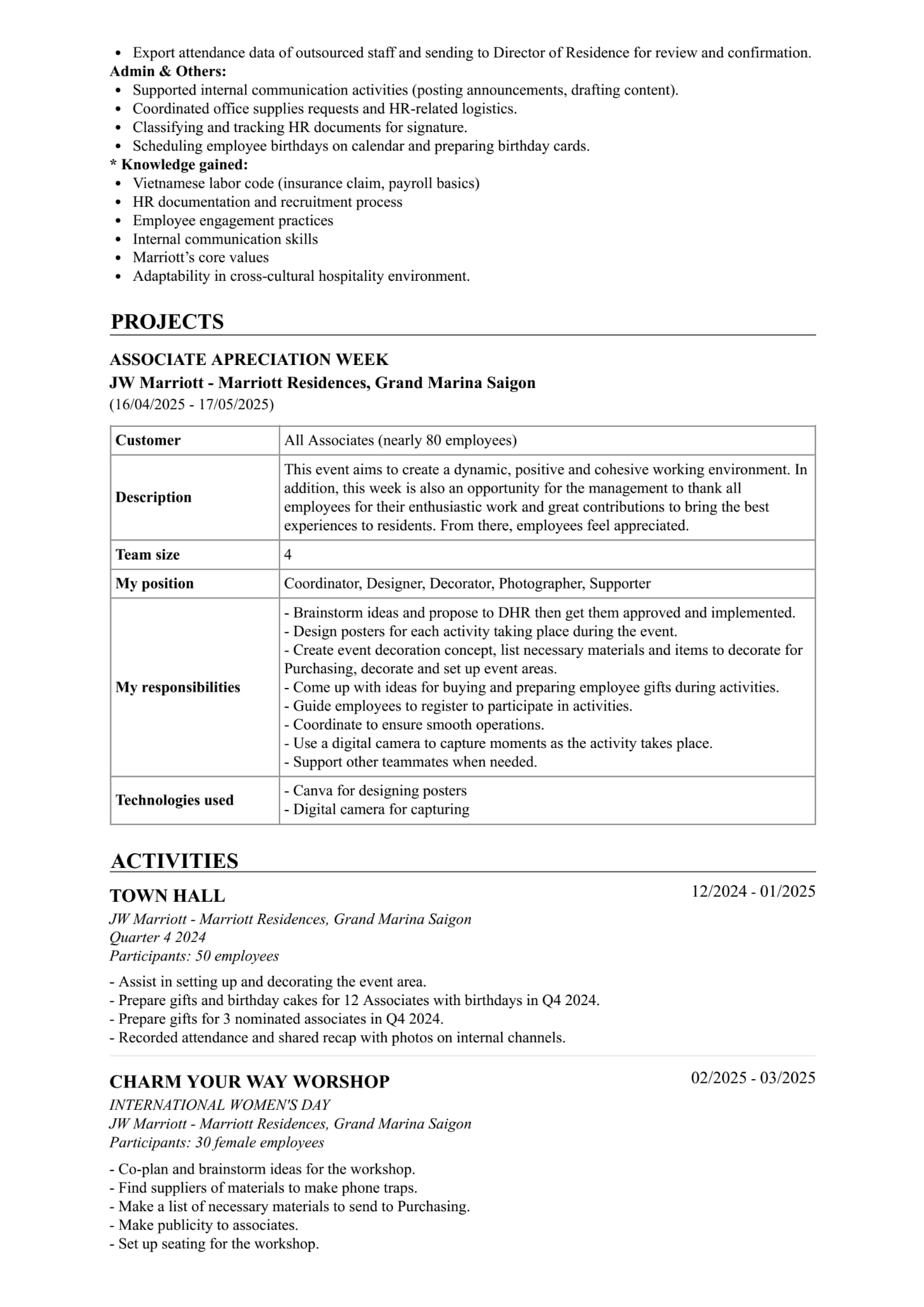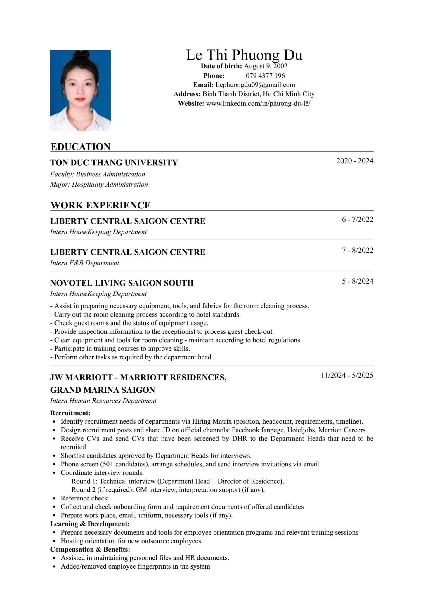 Recruitment: -Identify recruitment needs of departments via Hiring Matrix (position, headcount, requirements, timeline). -Design recruitment posts and share JD on official channels: Facebook fanpage, Hoteljobs, Marriott Careers. -Receive CVs and send CVs that have been screened by DHR to the Department Heads that need to be recruited. -Shortlist candidates approved by Department Heads for interviews. -Phone screen (50+ candidates), arrange schedules, and send interview invitations via email. -Coordinate interview rounds: Round 1: Technical interview (Department Head + Director of Residence). Round 2 (if required): GM interview, interpretation support (if any). -Reference check -Collect and check onboarding form and requirement documents of offered candidates -Prepare work place, email, uniform, necessary tools (if any). Learning & Development: -Prepare necessary documents and tools for employee orientation programs and relevant training sessions -Hosting orientation for new outsource employees Compensation & Benefits: -Assisted in maintaining personnel files and HR documents. -Added/removed employee fingerprints in the system Admin & Others: -Supported internal communication activities (posting announcements, drafting content). -Coordinated office supplies requests and HR-related logistics. -Classifying and tracking HR documents for signature. -Scheduling employee birthdays on calendar and preparing birthday cards. * Knowledge gained: -Vietnamese labor code (insurance claim, payroll basics) -HR documentation and recruitment process -Employee engagement practices -Internal communication skills -Marriott’s core values -Adaptability in cross-cultural hospitality environment.