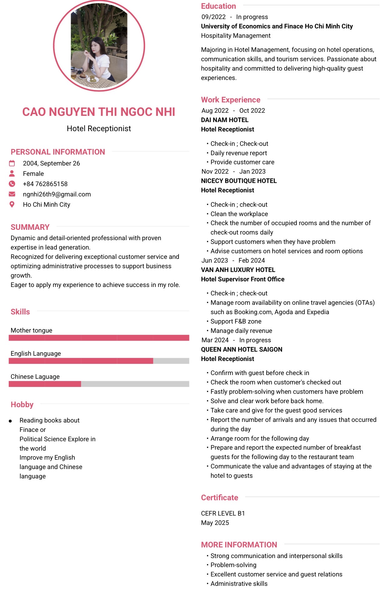 I'm Ngoc Nhi (Chloe) , im 21 years old and im senior at UEF (University Economics and Finance HCMC). I have 4 years of experience in the hospitality industry.