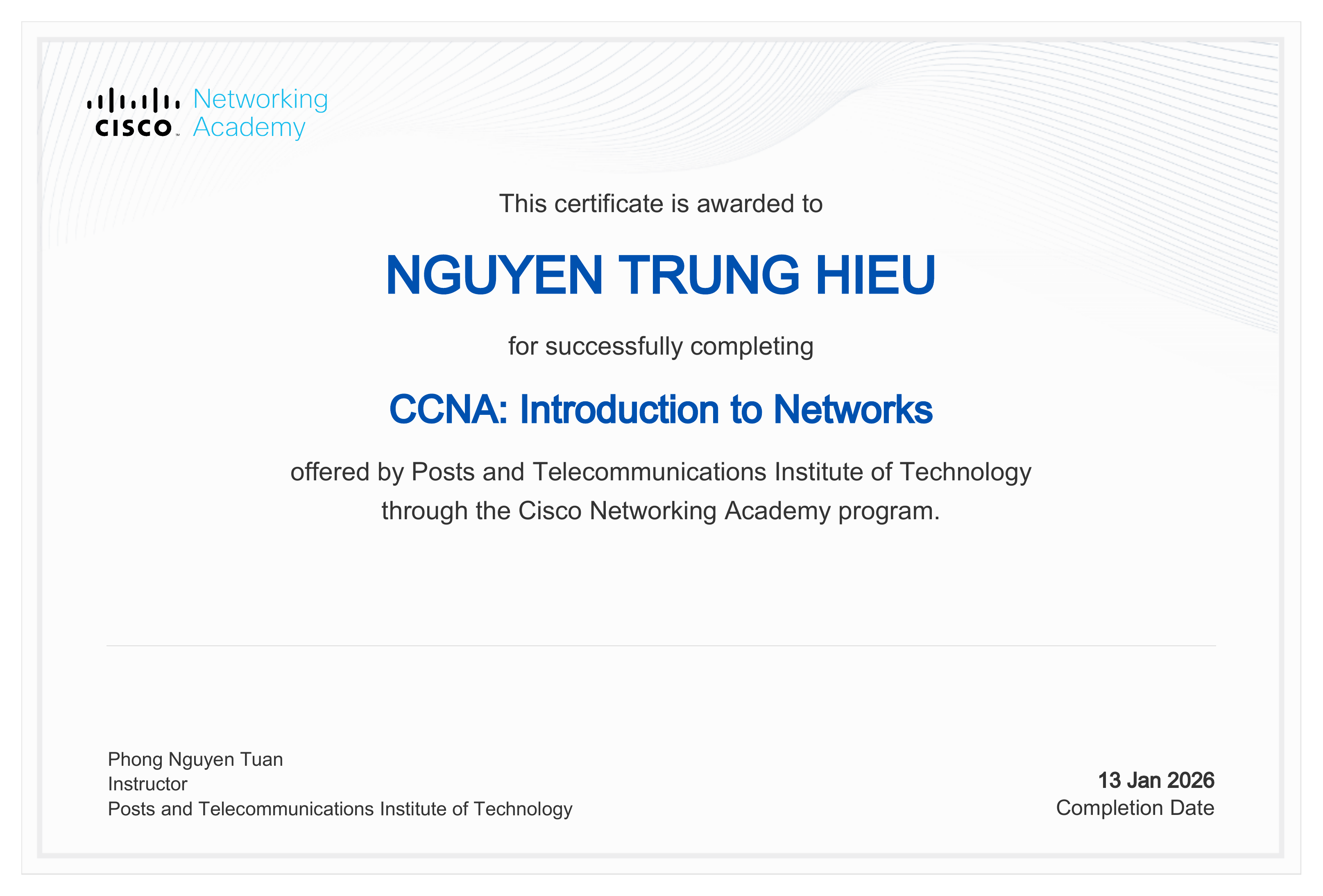 Cisco verifies the earner of this badge successfully completed the Introduction to Networks course and achieved this student level credential. Earner has knowledge of networking including IP addressing, how physical, data link protocols support Ethernet, can configure connectivity between switches, routers and end devices to provide access to local and remote resources. Earner participated in up to 54 labs and accumulated up to 14 hours of hands-on labs using Cisco hardware or Packet Tracer tool