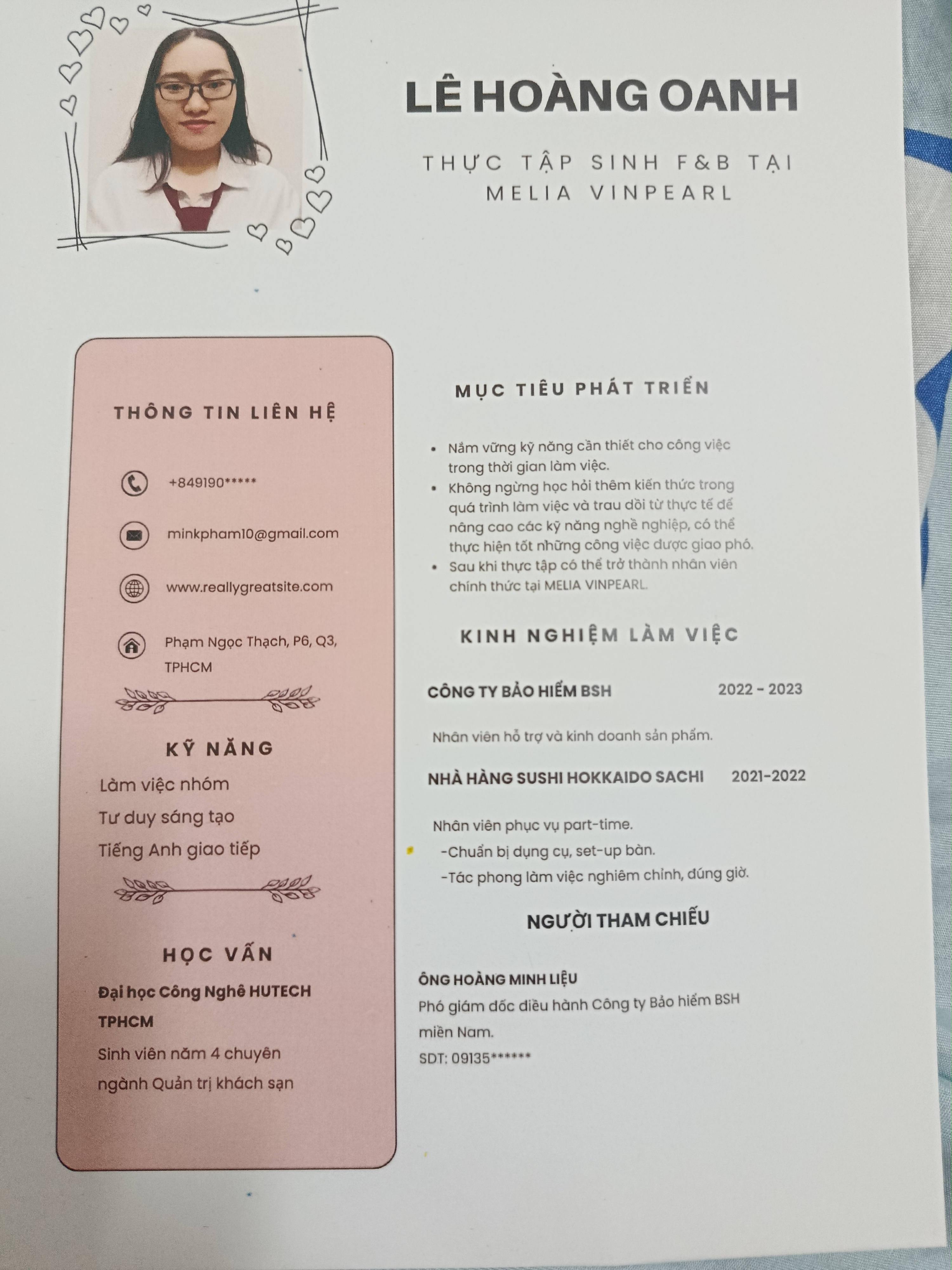 Học trong nghành quản trị khách sạn, đi trải nghiệm tại một số khách sạn như BOTON BLUE và INTERNET CONNECTION