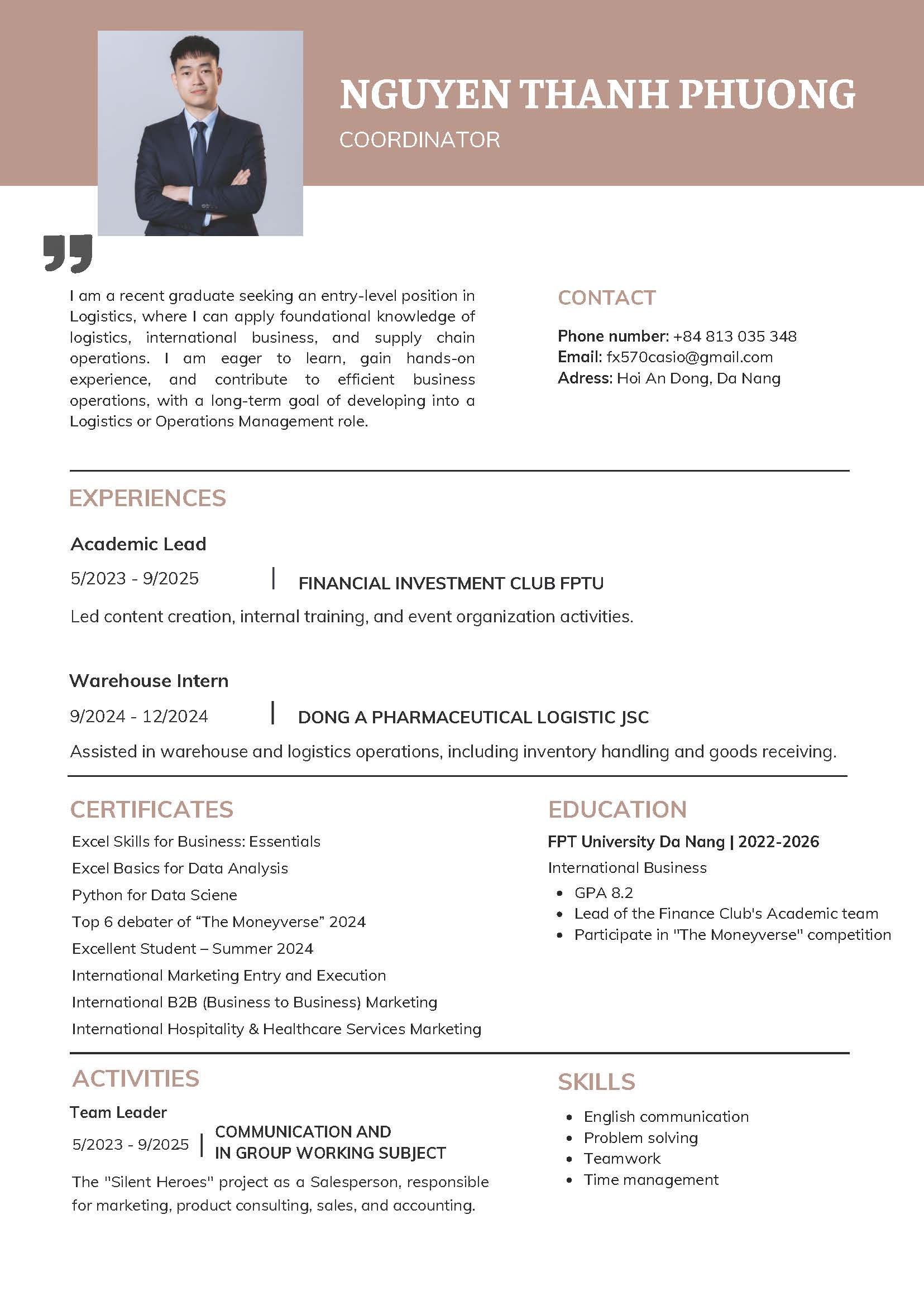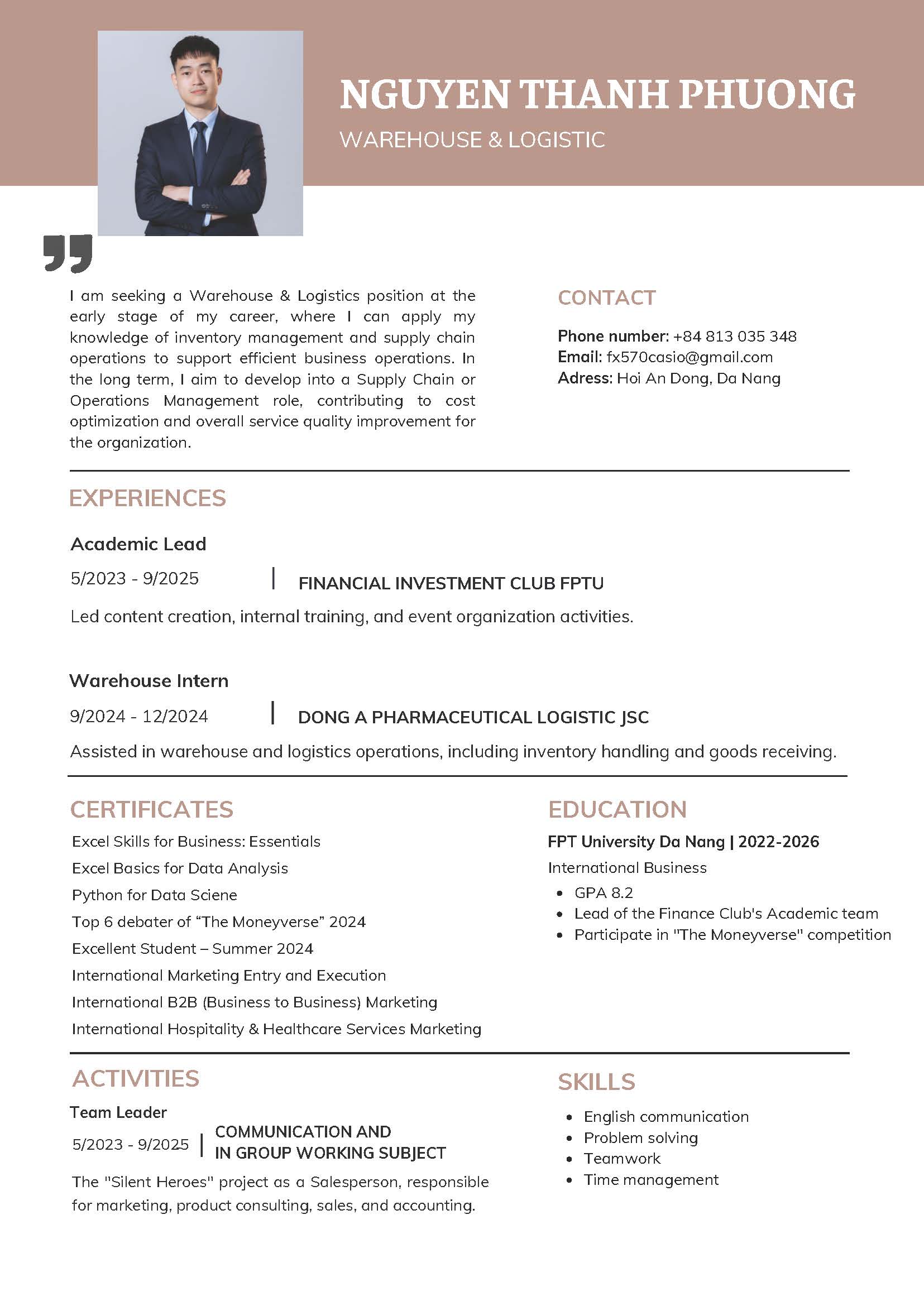 I am a recent graduate seeking opportunities in Warehouse, Logistics, or Coordinator roles. I have a solid foundation in warehouse operations, inventory management, and logistics coordination gained through academic study and practical projects. I have good English skills, with the ability to read, understand, and communicate effectively.