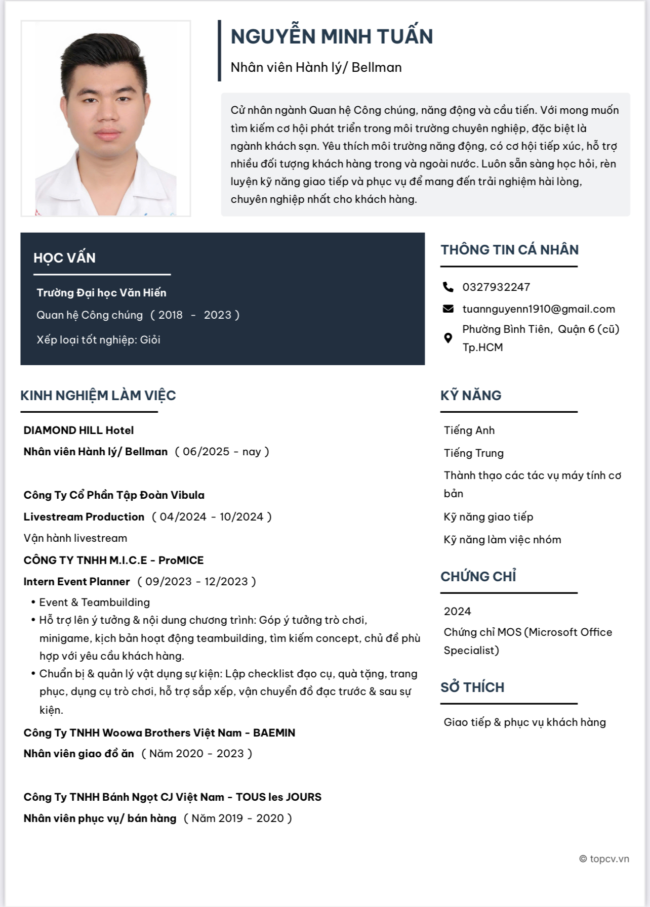 Em tốt nghiệp ngành Quan hệ công chúng, nhưng sau đó nhận ra mình rất yêu thích ngành nghề liên quan đến mô hình khách sạn