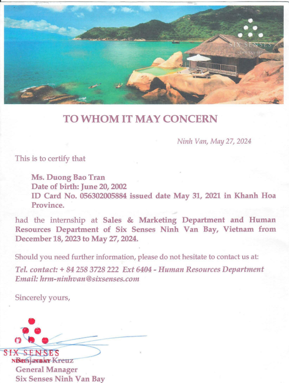 Training Intern tại Six Senses Ninh Van Bay