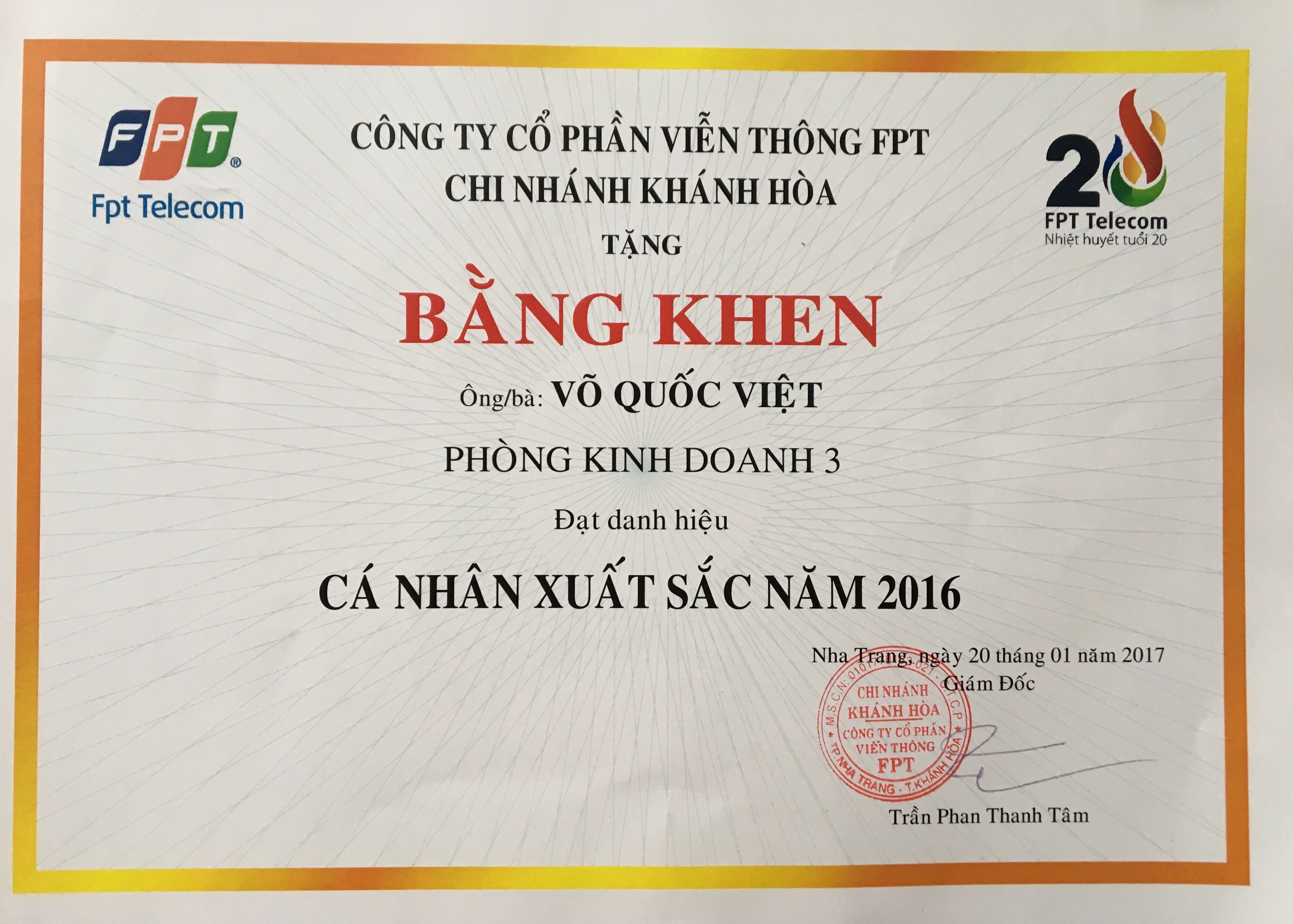 Là Nhân viên Xuất Sắc VPGD FPT TELECOM Chi Nhánh Khánh Hòa trong 2 Năm 2016 và 2017. Là thành viên của phòng kinh doanh Xuất Sắc toàn Tỉnh Khánh Hòa 2019.