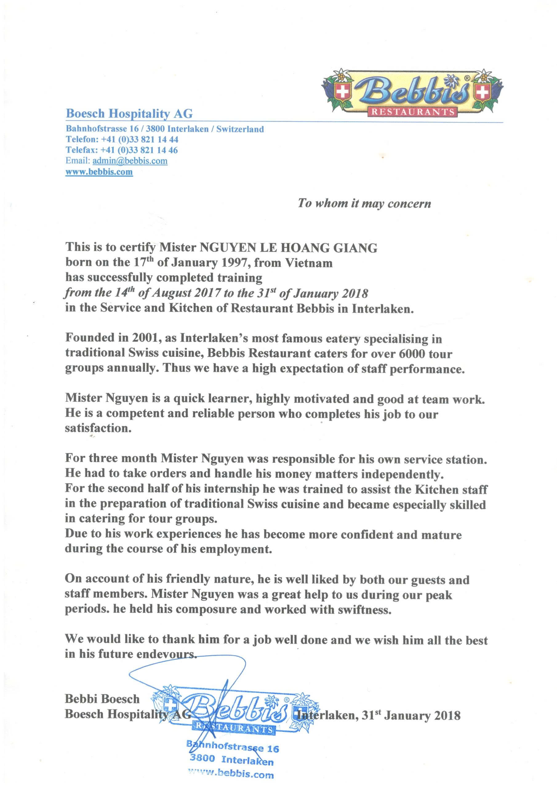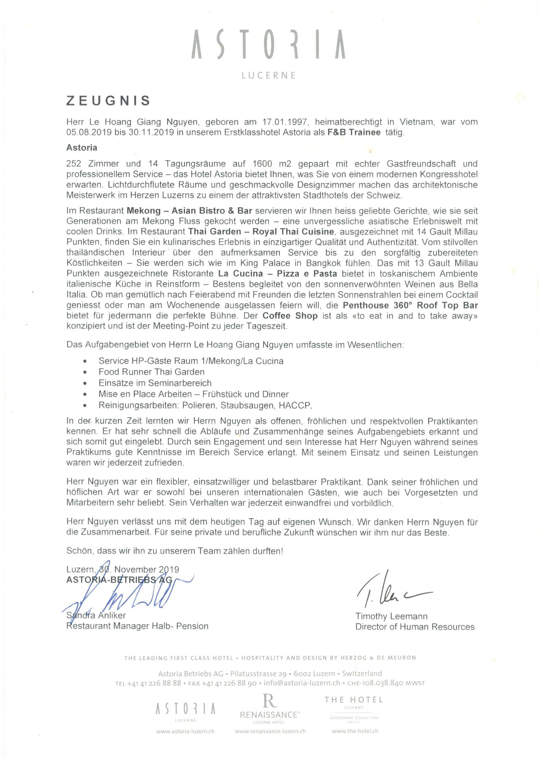 My name is Nguyen Le Hoang Giang. I graduated in Hospitality Management in Switzerland and Global Business in the United Kingdom. I have hands-on experience working in restaurants and hotels in Switzerland and the USA, including pre-opening operations at JW Marriott. In the last five years, I have also managed my own business, where I led sales, HR, production, and customer relationship management. I believe my international service background, leadership experience, and strong business mindset can bring real value to your company. I’m excited for the opportunity to contribute and grow with your team.