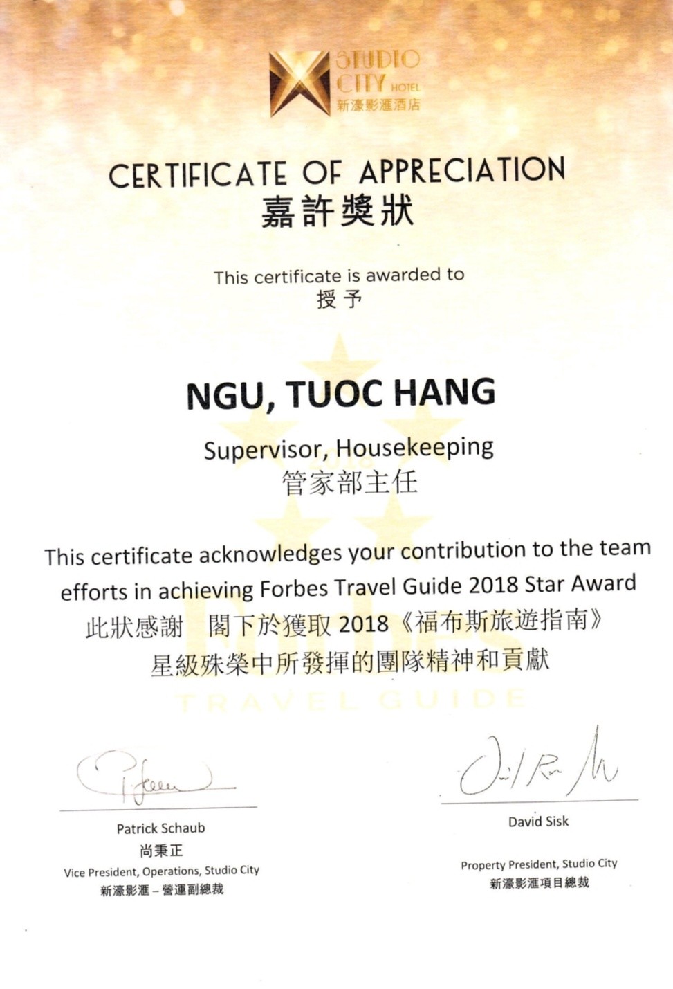 - Tham gia và đóng góp cho khách sạn đạt được danh hiệu Forbes bầu chọn làm khách sạn 5 sao năm 2018. - Đại sứ đào tạo cho nhân viên buồng phòng.