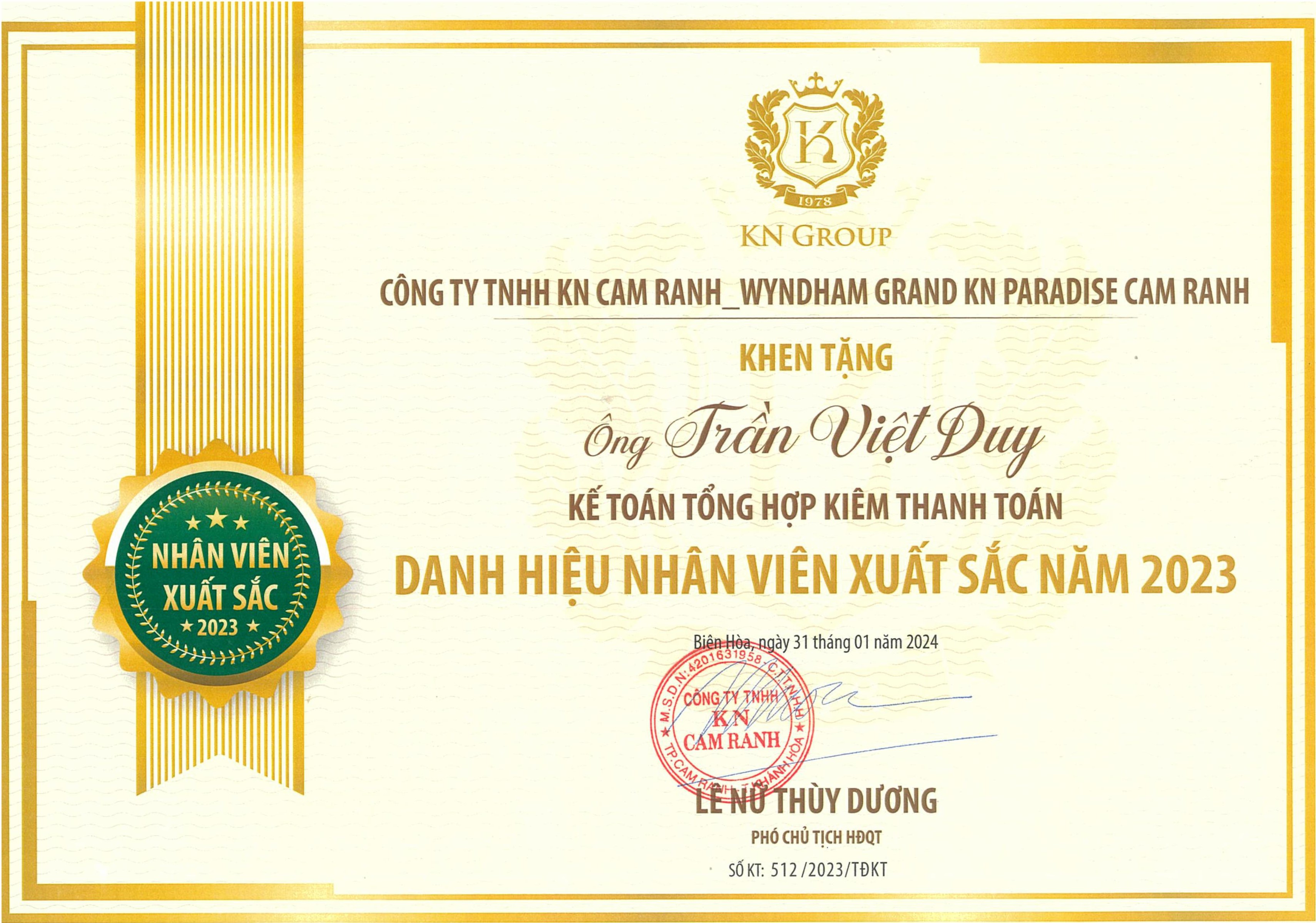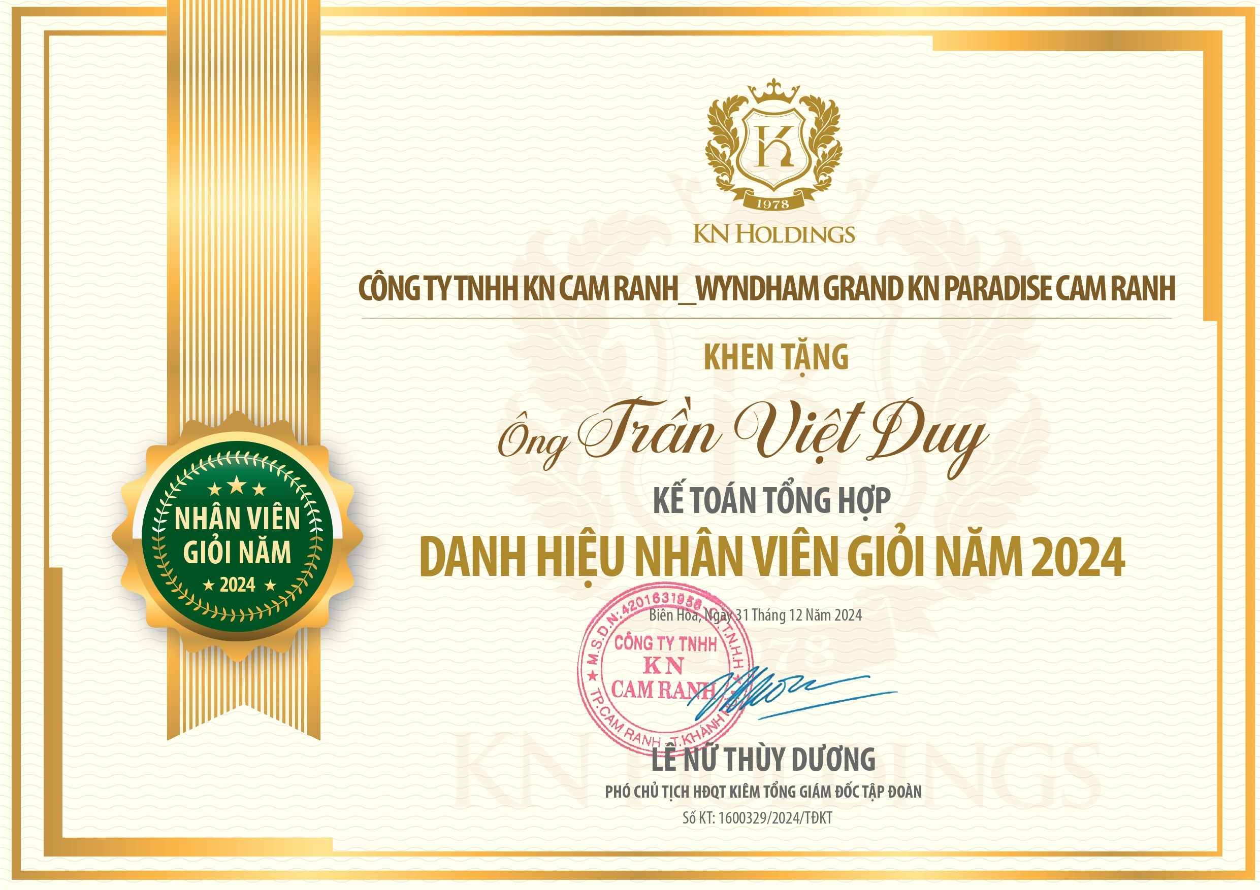 Awarded Excellent Employee of the Year 2024 at Wyndham Grand KN Paradise Cam Ranh Resort & Hotel.