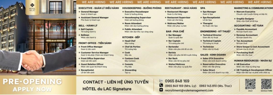 HOTEL du LAC SIGNATURE là khách sạn mới tọa lạc tại trái tim của phố cổ Hoàn Kiếm, Hà Nội. Mang phong cách tinh tế, hiện đại pha lẫn dấu ấn kiến trúc truyền thống, khách sạn hứa hẹn sẽ là điểm dừng chân lý tưởng cho du khách trong nước và quốc tế khi đến với Thủ đô ngàn năm văn hiến. Đến với HOTEL du LAC SIGNATURE, bạn không chỉ đến nghỉ dưỡng tại một khách sạn, mà bạn đang về “ngôi nhà thứ hai” của chinh mình nhờ sự phục vụ tận tâm của đội ngũ nhân viên nhiệt tình, chuyên nghiệp. Bất cứ khi nào bạn cần trợ giúp, nhân viên của chúng tôi sẽ lập tức có mặt để hỗ trợ hiệu quả nhất có thể. Hôtel du Lac hiểu rằng đây mới là giá trị đích thực vì được khách hàng tin tưởng cho kỳ nghỉ, chuyến công tác của mình. Với mục tiêu xây dựng một môi trường làm việc chuyên nghiệp, năng động và thân thiện, chúng tôi tìm kiếm những ứng viên tâm huyết, có tinh thần học hỏi và mong muốn phát triển cùng một thương hiệu khách sạn ngay từ những bước đầu tiên. Là thành viên của HOTEL du LAC SIGNATURE, bạn sẽ có cơ hội làm việc trong môi trường tiêu chuẩn quốc tế, được đào tạo bài bản và có lộ trình phát triển nghề nghiệp rõ ràng. Với đội ngũ nhân viên, chúng tôi đảm bảo đây là một mái nhà chung cho sự cống hiến, sự nỗ lực trong việc đem lại những trải nghiệm thực sự của ngành công nghiệp không khói. Các bạn, những ai đó đang đọc những lời giới thiệu này sẽ là một phần trong sự thành công của chúng tôi trong việc xây dựng một thương hiệu hoàn toàn nổi bật và khác biệt của du lịch Hà Thành nói riêng và của Việt Nam nói chung. Hãy cùng chúng tôi tạo nên dấu ấn khác biệt và cùng viết nên hành trình thành công tại HOTEL du LAC SIGNATURE!